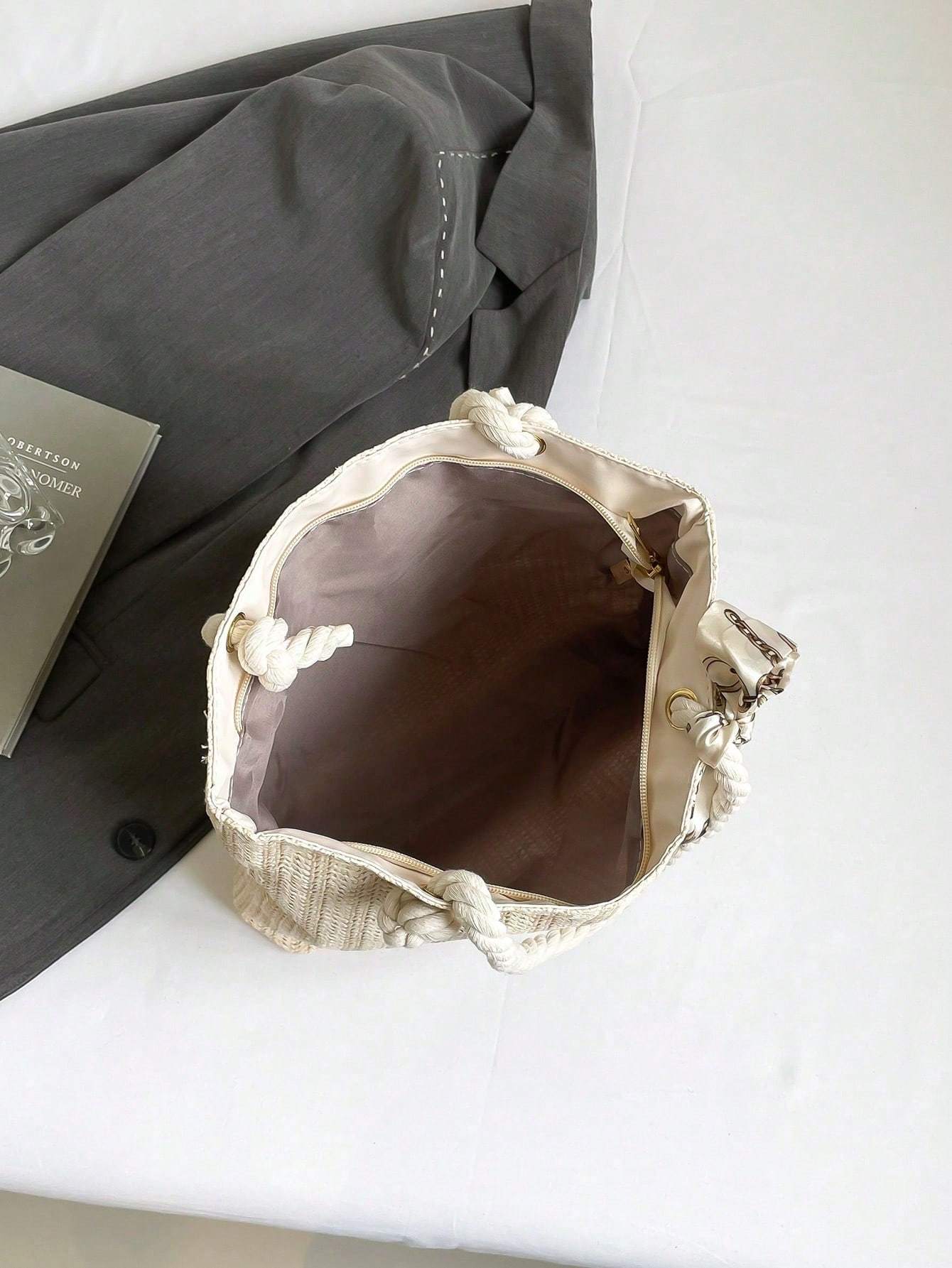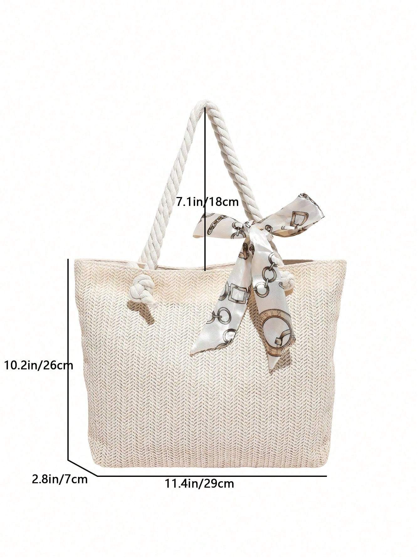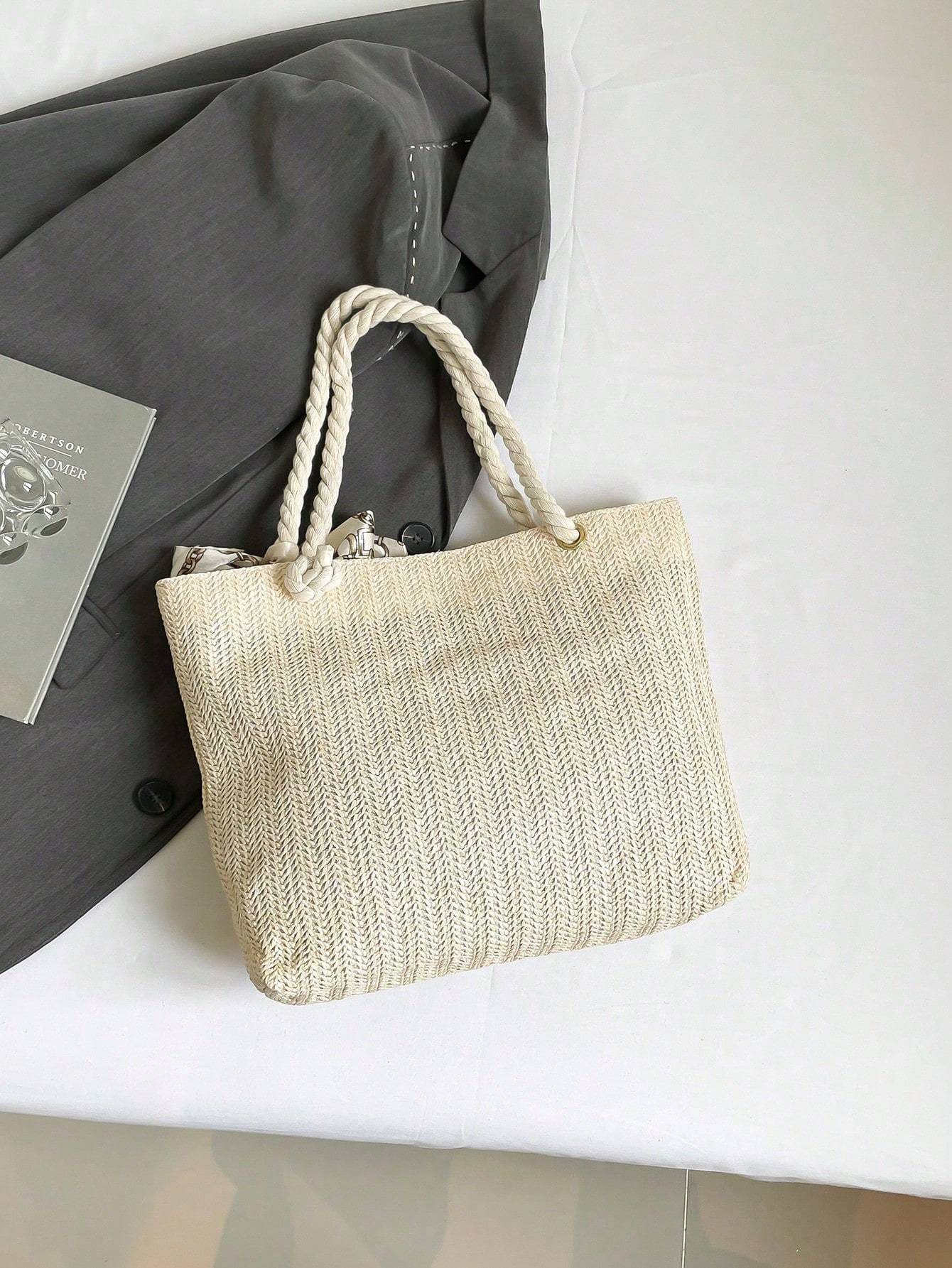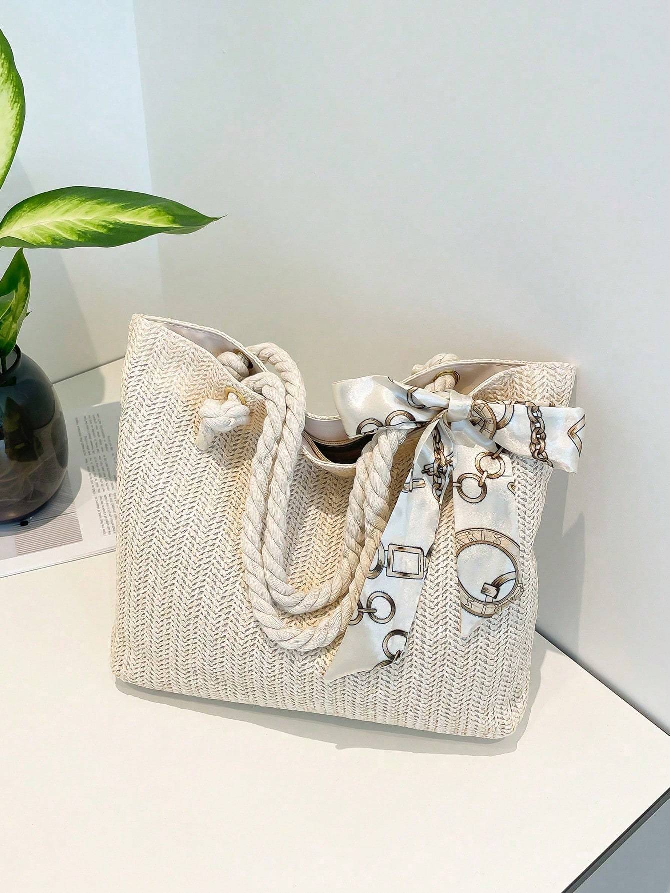 Women’s New Style Woven Large Capacity Bag Women’s Fashionable Straw Simple Silk Scarf Tote Bag